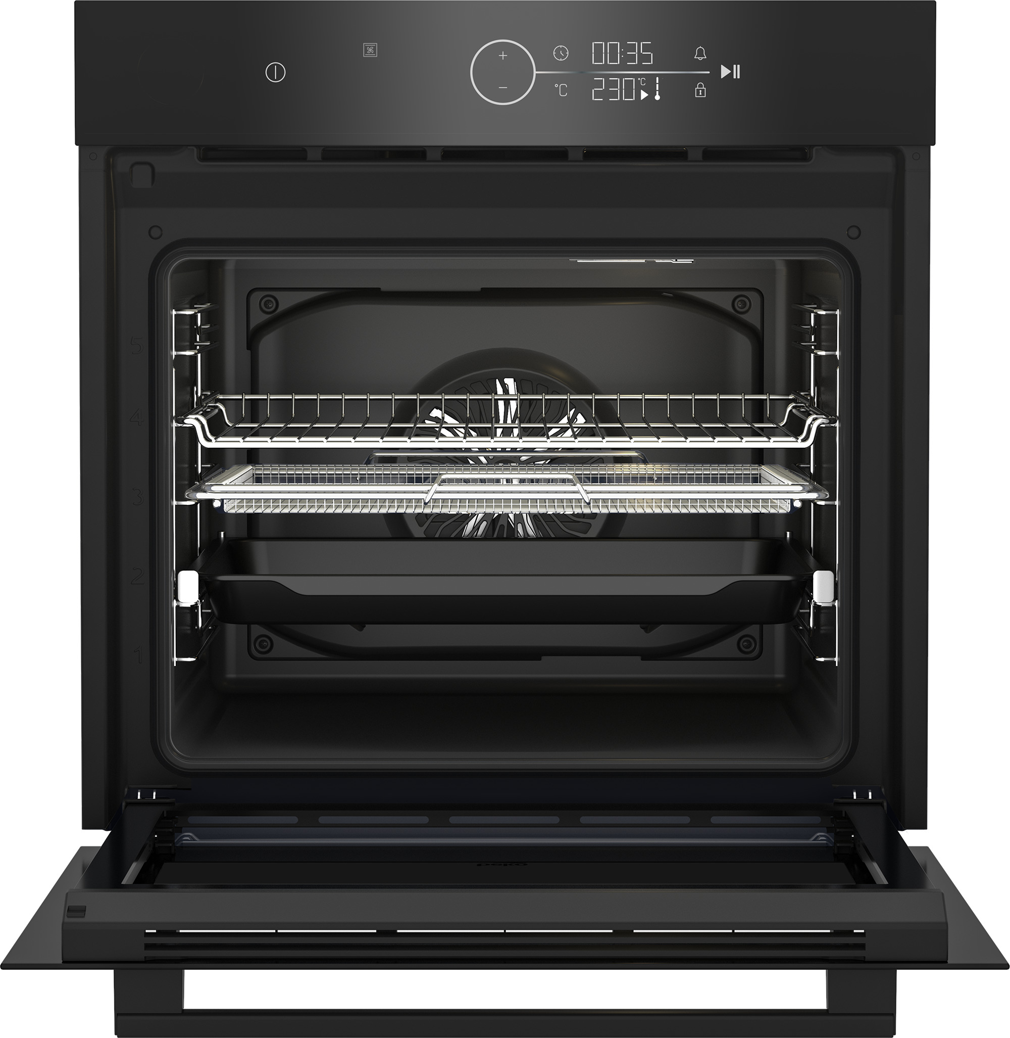 Soft Close -järjestelmä sulkee uunin oven pehmeästi ja äänettömästi. Teleskooppikiskot mahdollistavat pellin turvallisen ja vaivattoman ulosvedon. Kolmilasinen uuniluukku pitää ulkopinnan viileämpänä myös korkeissa lämpötiloissa.