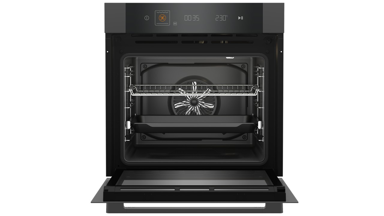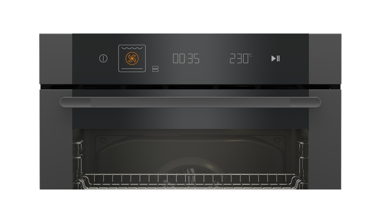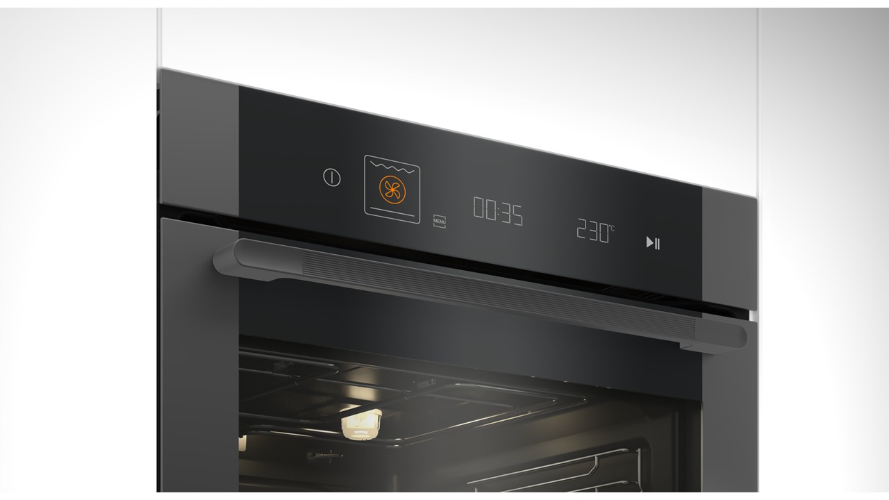 Uunin ovi sulkeutuu hiljaisesti ja hallitusti, mikä lisää käyttömukavuutta.
