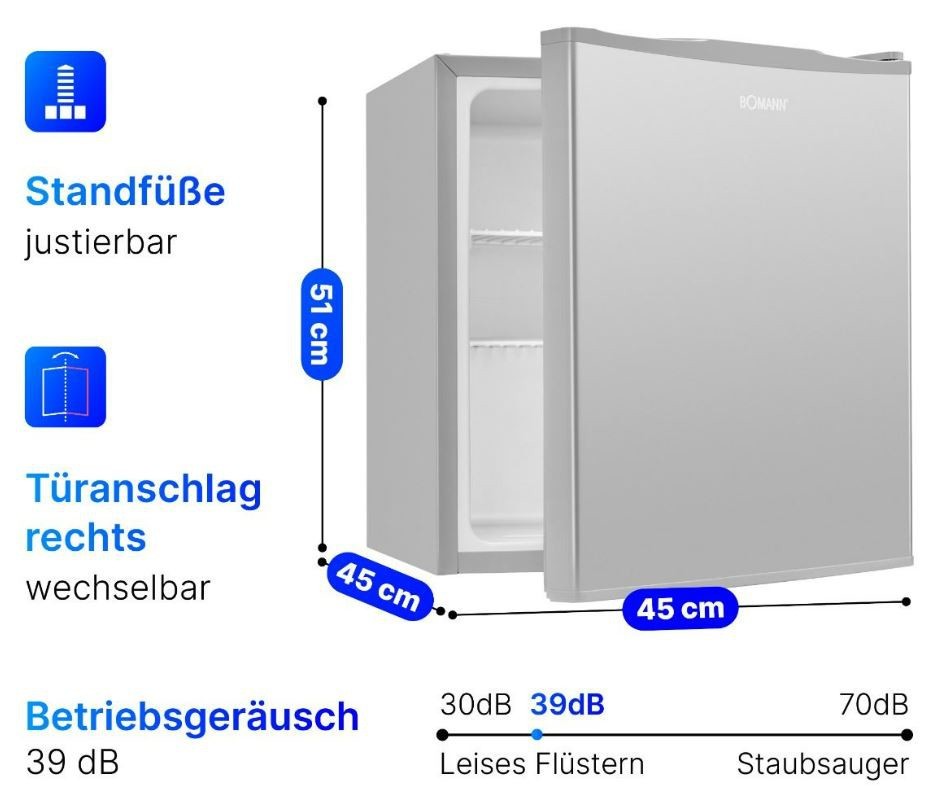 Bomann KB7346IX on pienikokoinen ja monikäyttöinen minijääkaappi, joka sopii erinomaisesti toimistoon, mökille, camping-käyttöön tai vaikka pelikoneen viereen. 42 litran tilavuus ja erittäin hiljainen käyntiääni tekevät siitä huomaamattoman mutta käytännöllisen kylmäsäilytysratkaisun.