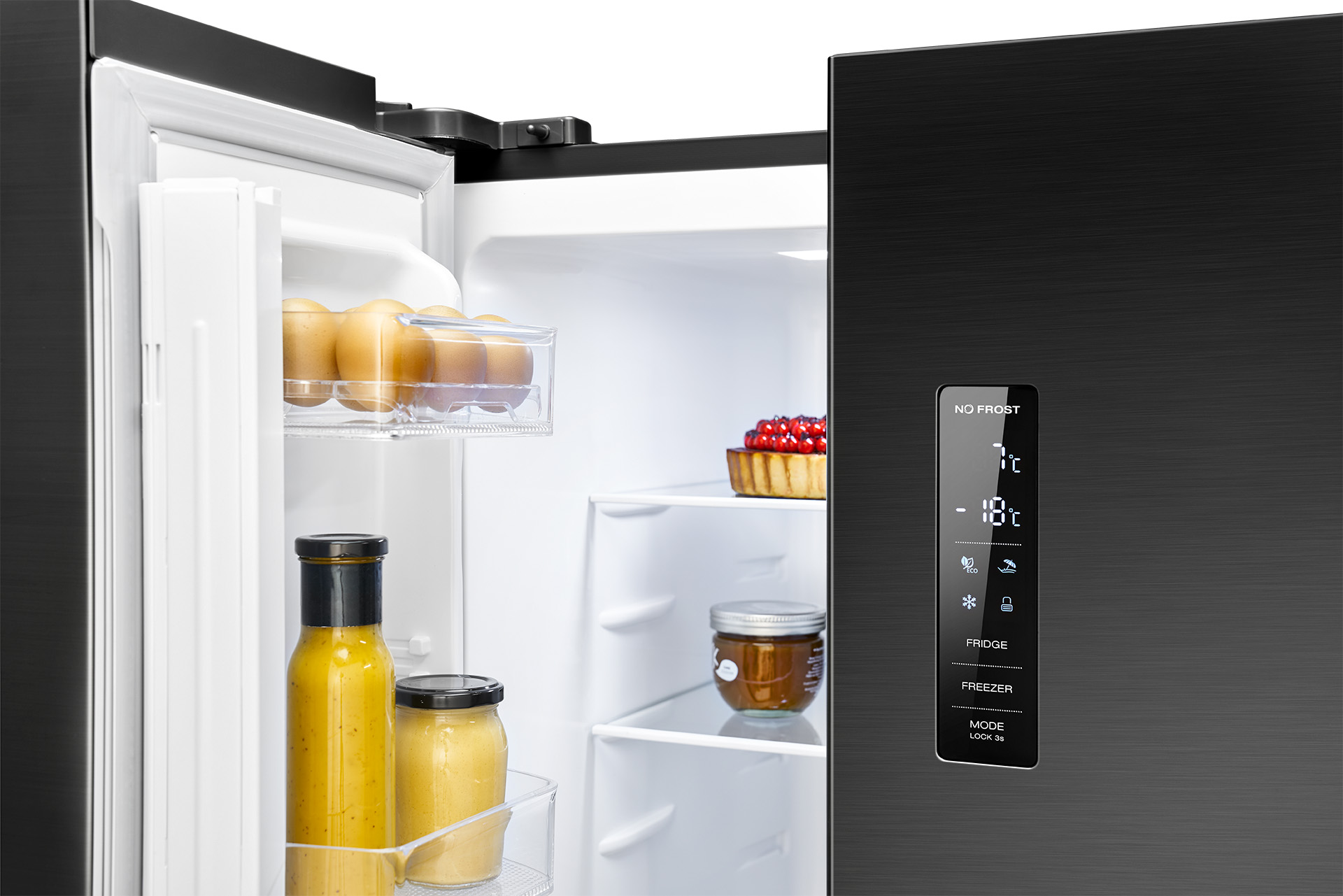 Jääkaapin ovessa sijaitseva digitaalinen LED-näyttö mahdollistaa lämpötilojen ja toimintojen helpon säädön sekä nopean yleiskuvan asetuksista ilman oven avaamista.