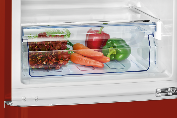 Jääkaapissa on neljä lasihyllyä, joista kolme on korkeussäädettäviä. Läpinäkyvä vihanneslaatikko pitää tuoreet tuotteet helposti nähtävillä. Oven neljä säilytyslokeroa, munakotelo sekä krominen pulloteline tarjoavat runsaasti tilaa pulloille ja pienemmille elintarvikkeille. LED-sisävalaistus valaisee kaapin tasaisesti ja energiatehokkaasti.