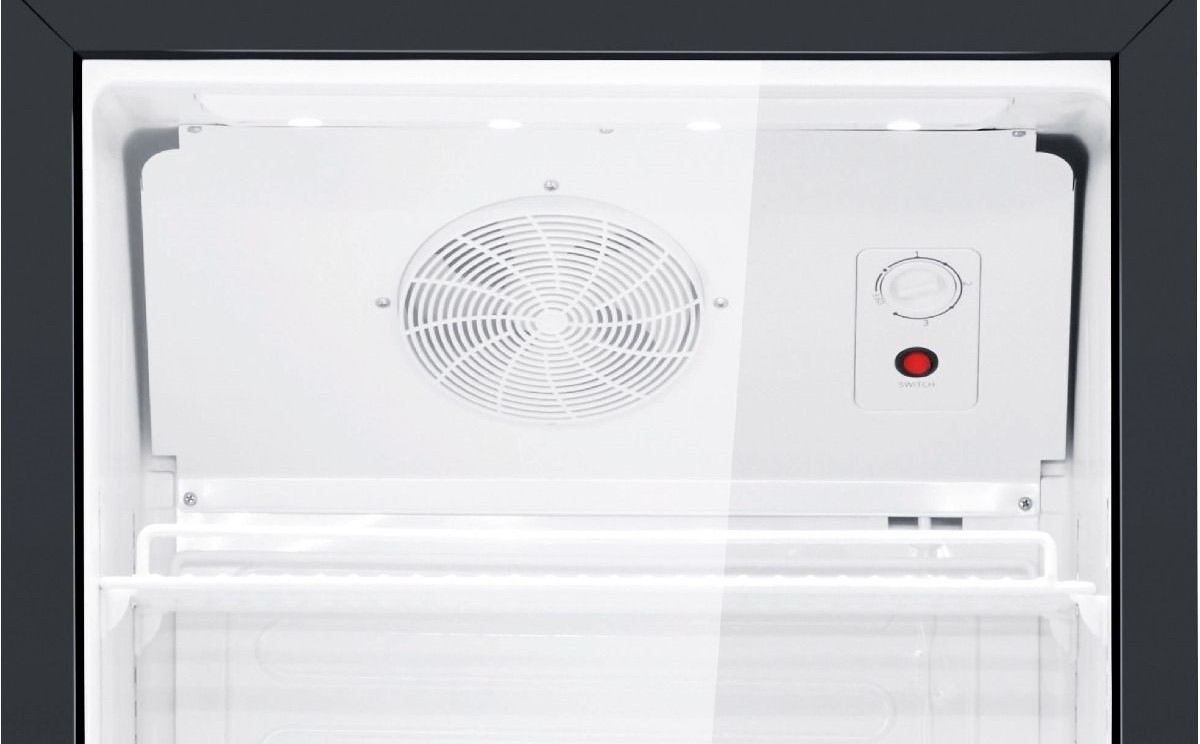 Sisäinen ilmankiertopuhallin huolehtii tasaisesta lämpötilasta koko kaapin alueella. Jatkuva ilman kierto ehkäisee lämpötilaeroja ja varmistaa, että juomat ja elintarvikkeet pysyvät tasaisesti viileinä.