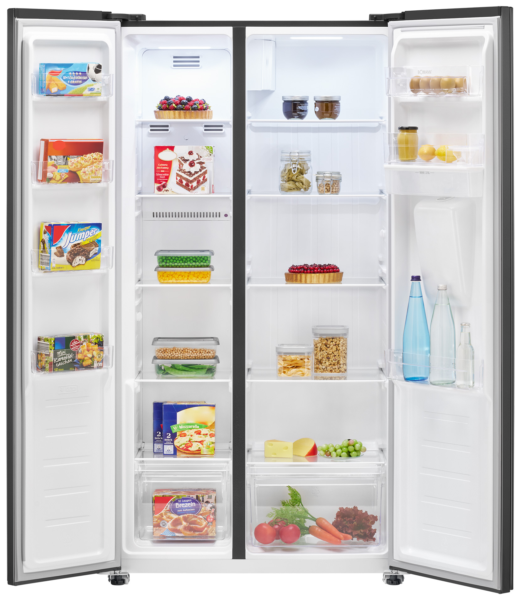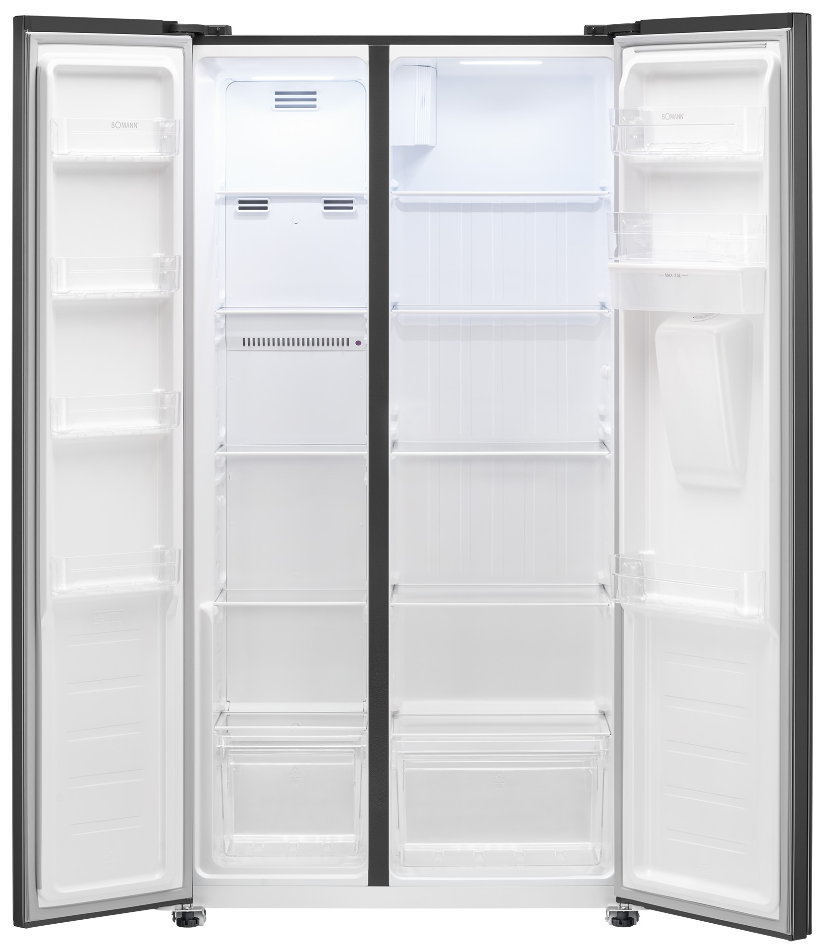 Bomann SBS7367DIX on tilava side-by-side jääkaappi, joka yhdistää modernin muotoilun, NoFrost-teknologian ja käytännölliset ominaisuudet. 2,5 litran vesisäiliö tuo lisää käyttömukavuutta arkeen.