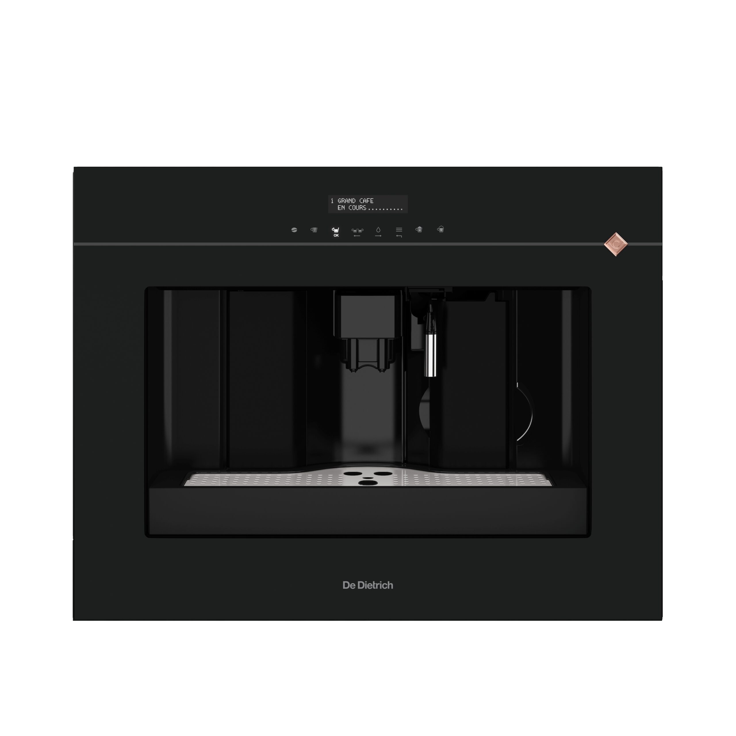 <p><strong>Fully automatic built-in espresso machine De Dietrich!</strong></p><p><strong>Coffee tailored to your personality</strong> – whether espresso or a subtle blend, you can adjust the exact dose and aroma, from mild to intense. In this way, each cup can be adapted to individual tastes.<br><strong>Telescopic rails </strong>- allows the device to be moved in-and-out of the furniture, blending the device into the kitchen and providing extra storage space for coffee beans, etc.</p><p>The device has a time display and an <strong>automatic start function</strong>, which allows you to set automatic coffee preparation at the desired time.</p><p><strong>Automatic cleaning function </strong>for when the device turns off, stand by time can be selected from 15 min to 3 hours.<br><strong>Notifications </strong>for refilling water and coffee tanks and emptying the waste container.<br><strong>Reminders </strong>to change the water filter and perform automatic descaling.</p><p>Water hardness level, screen brightness, and sound signals can be adjusted.</p><p>Milk frothing container included.</p>