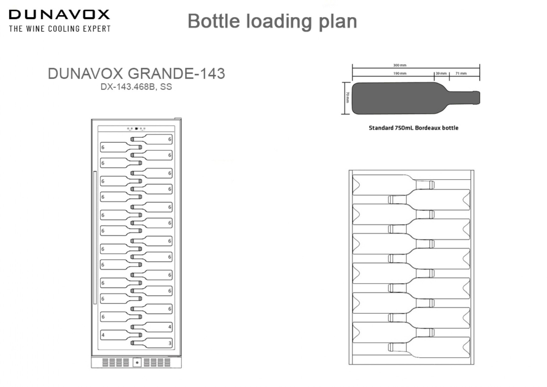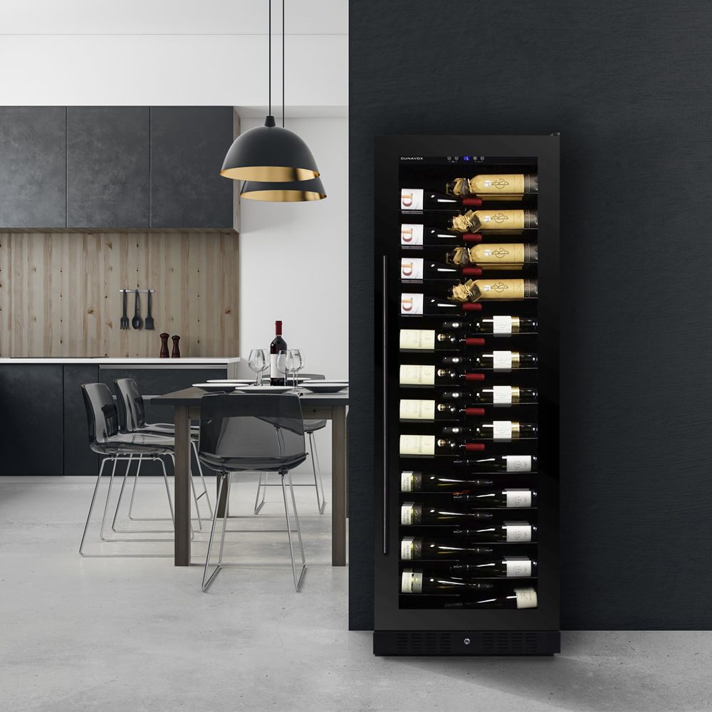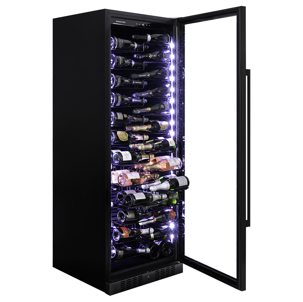 Dunavox DX143.468B on näyttävä ja tilava viinikaappi, joka on suunniteltu erityisesti suurille pulloille ja tarjoaa huippuluokan säilytysolosuhteet.