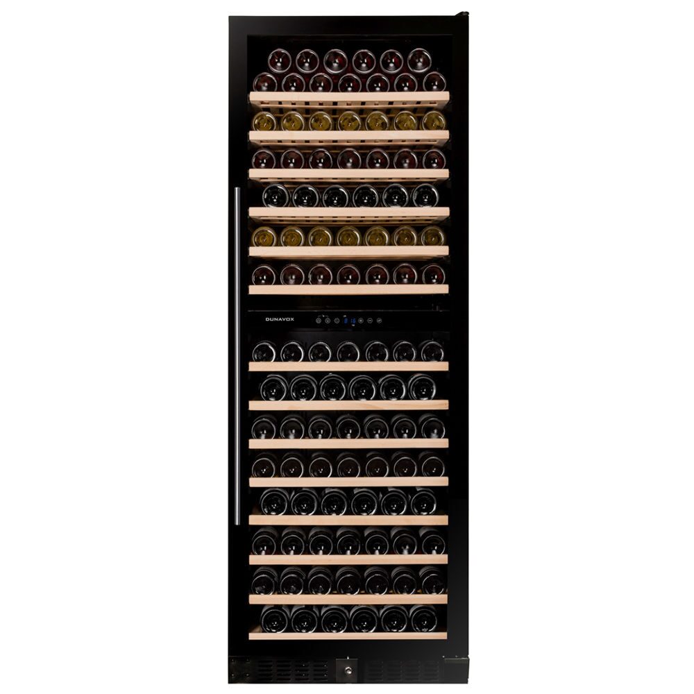Dunavox DX181.490DBK on suuri ja laadukas viinikaappi, joka tarjoaa kaksivyöhykkeisen säilytyksen, näyttävän ulkonäön ja ammattitason suorituskyvyn.