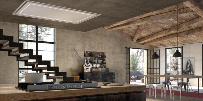 Sisäänrakennettava asennus vapauttaa näkymän keittiössä ja korostaa tilan avaruutta. Ohut teräspaneeli sulautuu saumattomasti kattopintaan, jolloin liesituuletin ei hallitse tilaa visuaalisesti, vaan täydentää keittiön kokonaisdesignia hillitysti.
