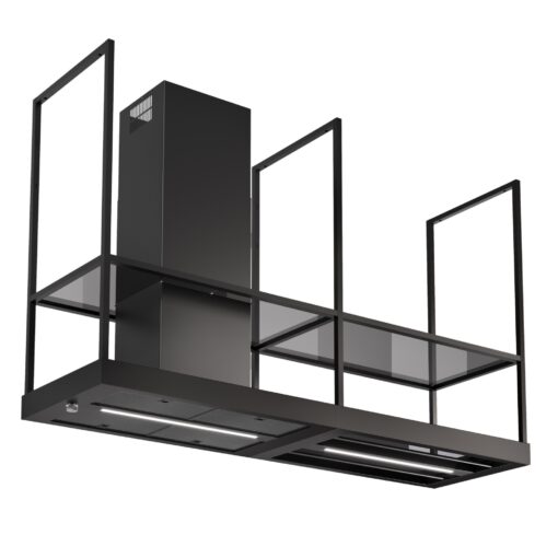 Faber TSHELFBLACK on ikoninen saarekeliesituuletin, joka yhdistää tehokkaan ilmanvaihdon ja käytännöllisen säilytystilan näyttäväksi kokonaisuudeksi. Teollishenkinen muotoilu, avoin ristikkorakenne ja savunväriset lasihyllyt tekevät siitä vahvan sisustuselementin avoimiin ja moderneihin keittiöihin. TSHELFBLACK ei ole pelkkä liesituuletin, vaan monikäyttöinen osa keittiön arkkitehtuuria.