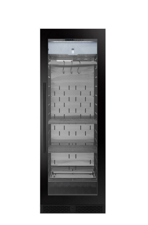 Kaksinkertainen lasiovi UV-suodattimella (Low-E) suojaa lihaa valolta ja auttaa ylläpitämään vakaita olosuhteita energiatehokkaasti. LED-sisävalaistus kytkimellä takaa hyvän näkyvyyden kypsytysprosessin seurantaan. Oven kätisyys on vaihdettavissa.