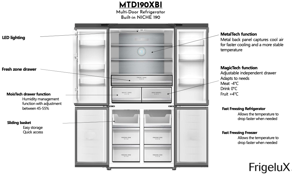 Frigelux MTD190XBI on moderni ja harkitusti suunniteltu multi-door side-by-side -jääkaappi, joka soveltuu sekä vapaasti sijoitettavaksi että kalusteiden alle integroitavaksi. Malli on kehitetty erityisesti keittiöihin, joissa halutaan yhdistää suuri säilytystila, joustava organisointi ja viimeistelty ulkonäkö.