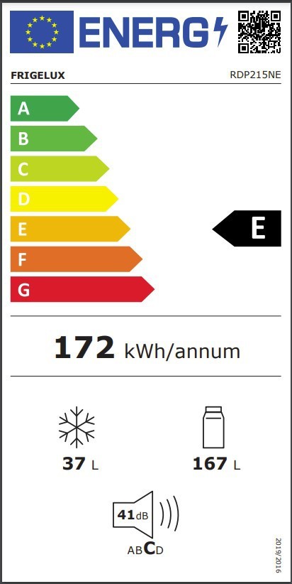 Energialuokka E ja vuotuinen energiankulutus 172 kWh tarjoavat hyvän tasapainon suorituskyvyn ja energiankulutuksen välillä. Melutaso on vain 41 dB, joten laite soveltuu hyvin myös avoimiin keittiötiloihin.