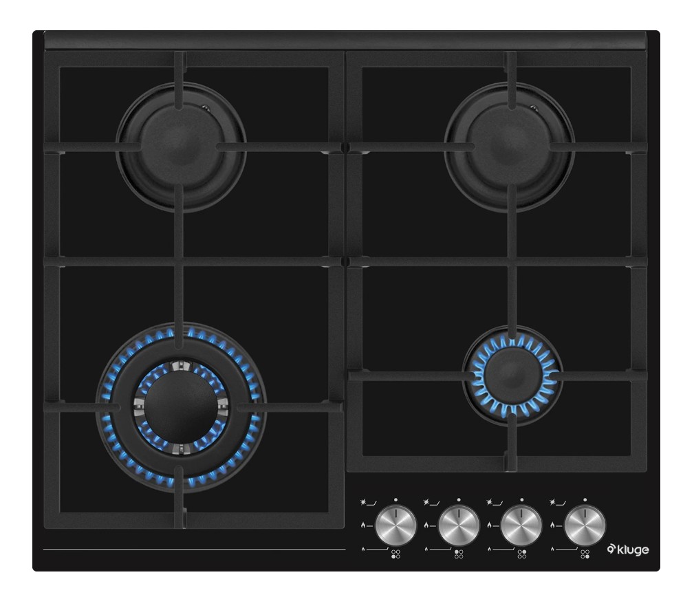 Kluge KPG6010BG 60 cm wide gas hob with 4 burners and black glass ceramic surface.