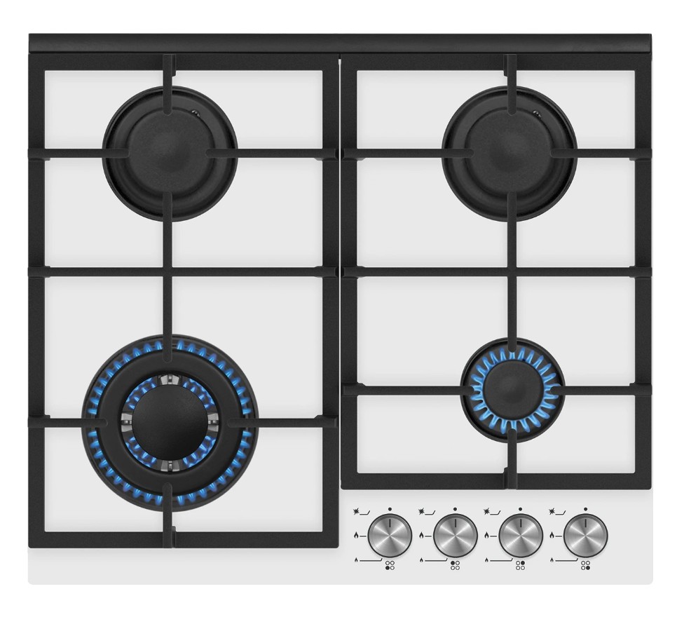 Kluge 60 cm wide 4-burner gas hob with white glass-ceramic surface.