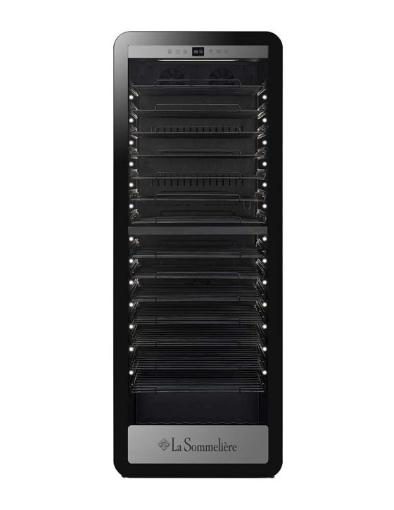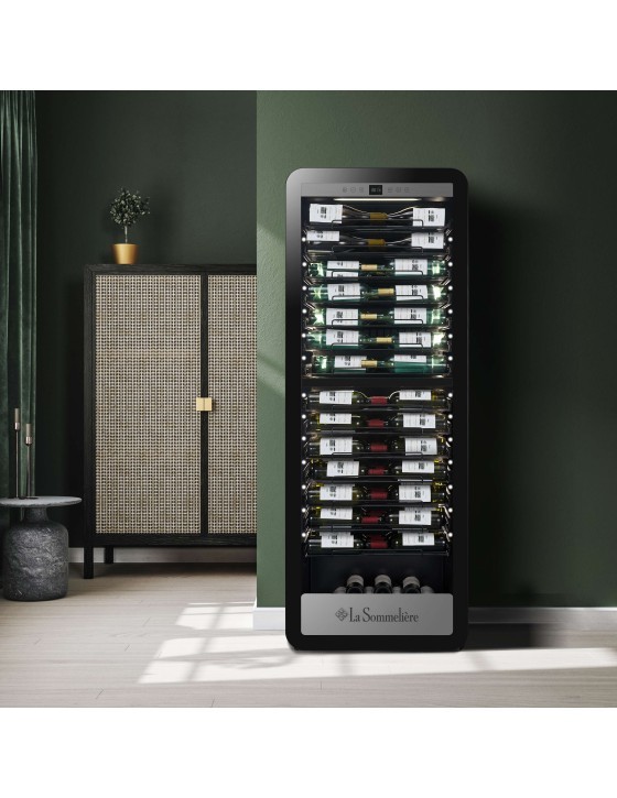 La Sommeliere APOGEE185DZPRO on näyttävä ja teknisesti huippuluokan viinikaappi, joka yhdistää suuren kapasiteetin, kaksivyöhykkeisen säilytyksen ja etähallinnan ainutlaatuisessa, pyöristetyssä designissa.