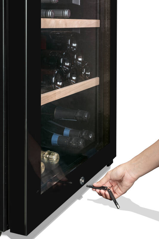 Visuaaliset ja äänelliset hälytykset ilmoittavat, jos kaappi vaatii huomiota. Integroitu lukko lisää turvallisuutta ja suojaa arvokasta viinikokoelmaa.