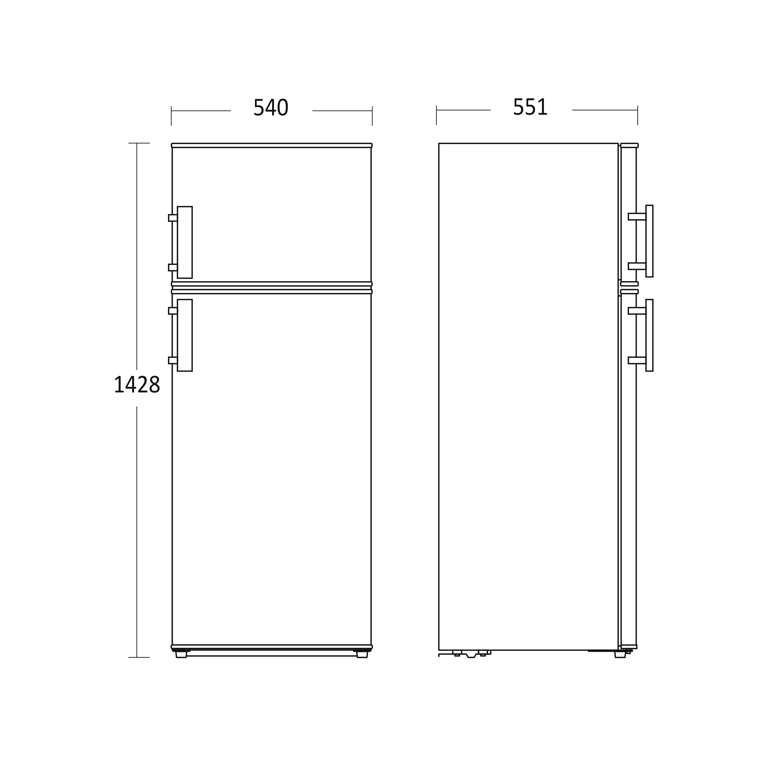 Korkeus 1428 mm, leveys 540 mm, syvyys 551 mm.