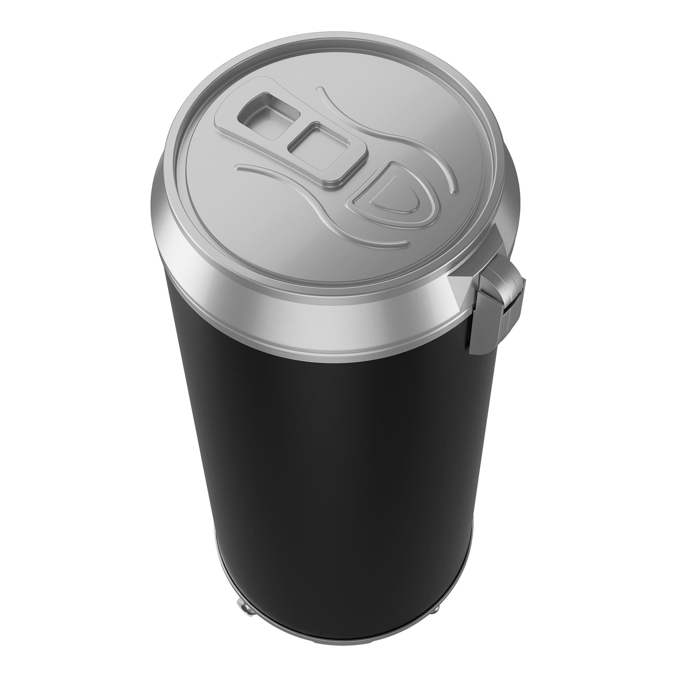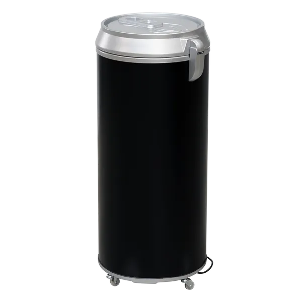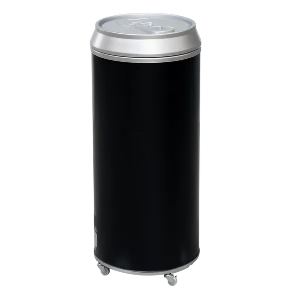 Pyöreä tynnyrimuoto tekee kaapista todellisen katseenvangitsijan, joka ei vie paljon lattiatilaa. Musta runko voidaan haluttaessa teipata tai brändätä oman ilmeen mukaiseksi, ja koristeellinen kansi on muotoiltu aidon tölkin näköiseksi. Muotoilu mahdollistaa sijoittamisen niin sisä- kuin ulkotiloihin.