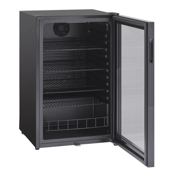 Kylmäkaapissa on musta runko ja musta lasiovi ohuella kehyksellä, joka antaa kaapille modernin ja tyylikkään ulkonäön. Kaapissa on neljä säädettävää mustaa ritilähyllyä, joiden avulla tuotteet voidaan järjestää eri kokoisille pulloille ja tölkeille sopivasti. Hyllyjen maksimikuormitus on 26 kg.