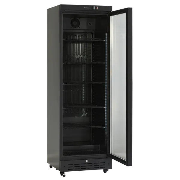 Kylmäkaapissa on tyylikäs musta runko ja lasiovi, joka tuo tuotteet hyvin esille. Kaapissa on viisi vahvaa mustaa ritilähyllyä, jotka voidaan säätää eri korkeuksille. Tämä mahdollistaa erikokoisten pullojen, tölkkien ja muiden tuotteiden sijoittamisen vakaasti ja selkeästi.