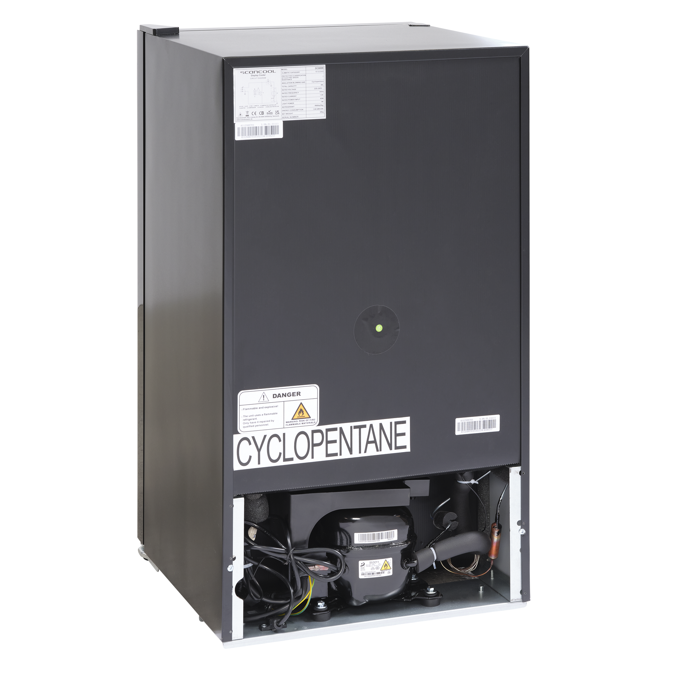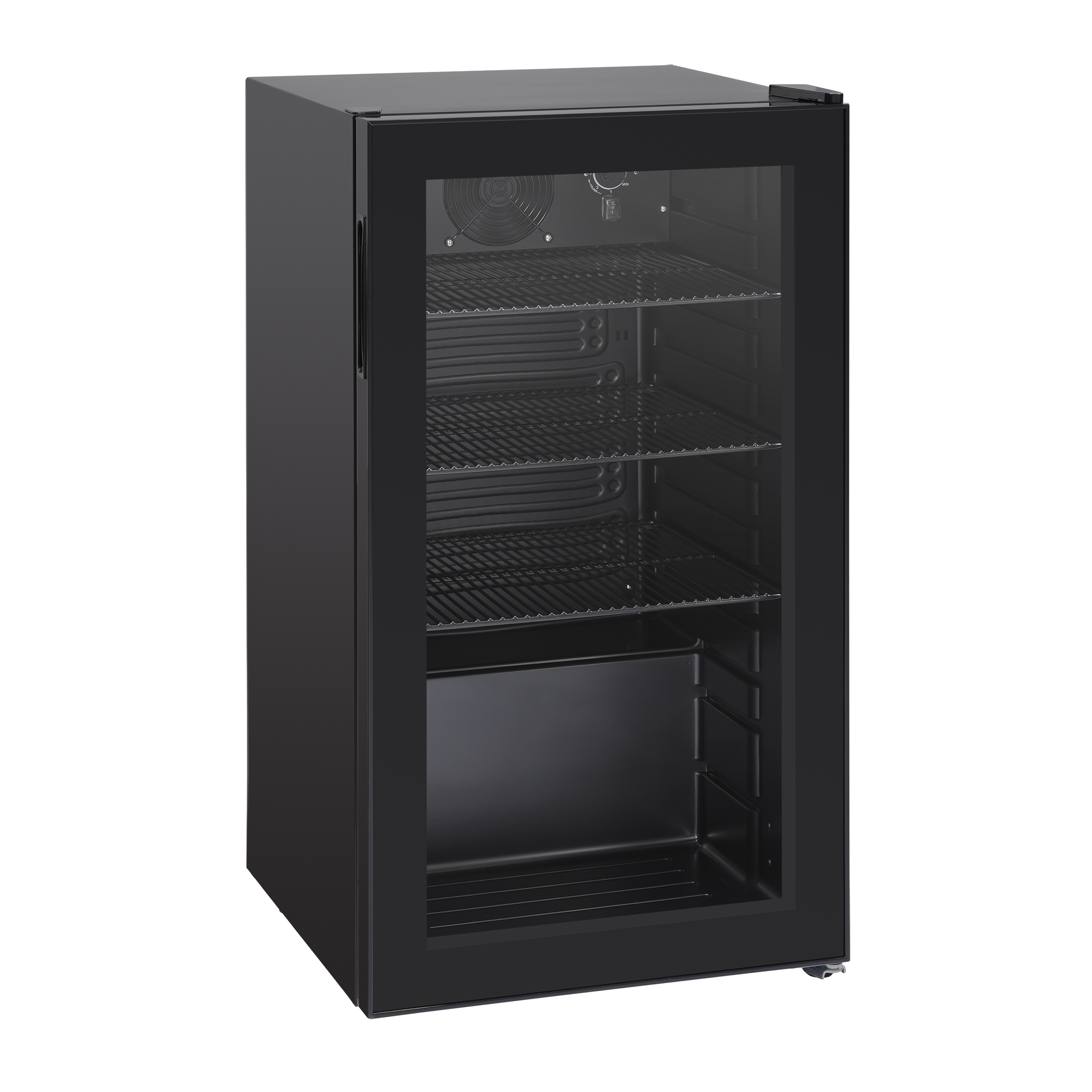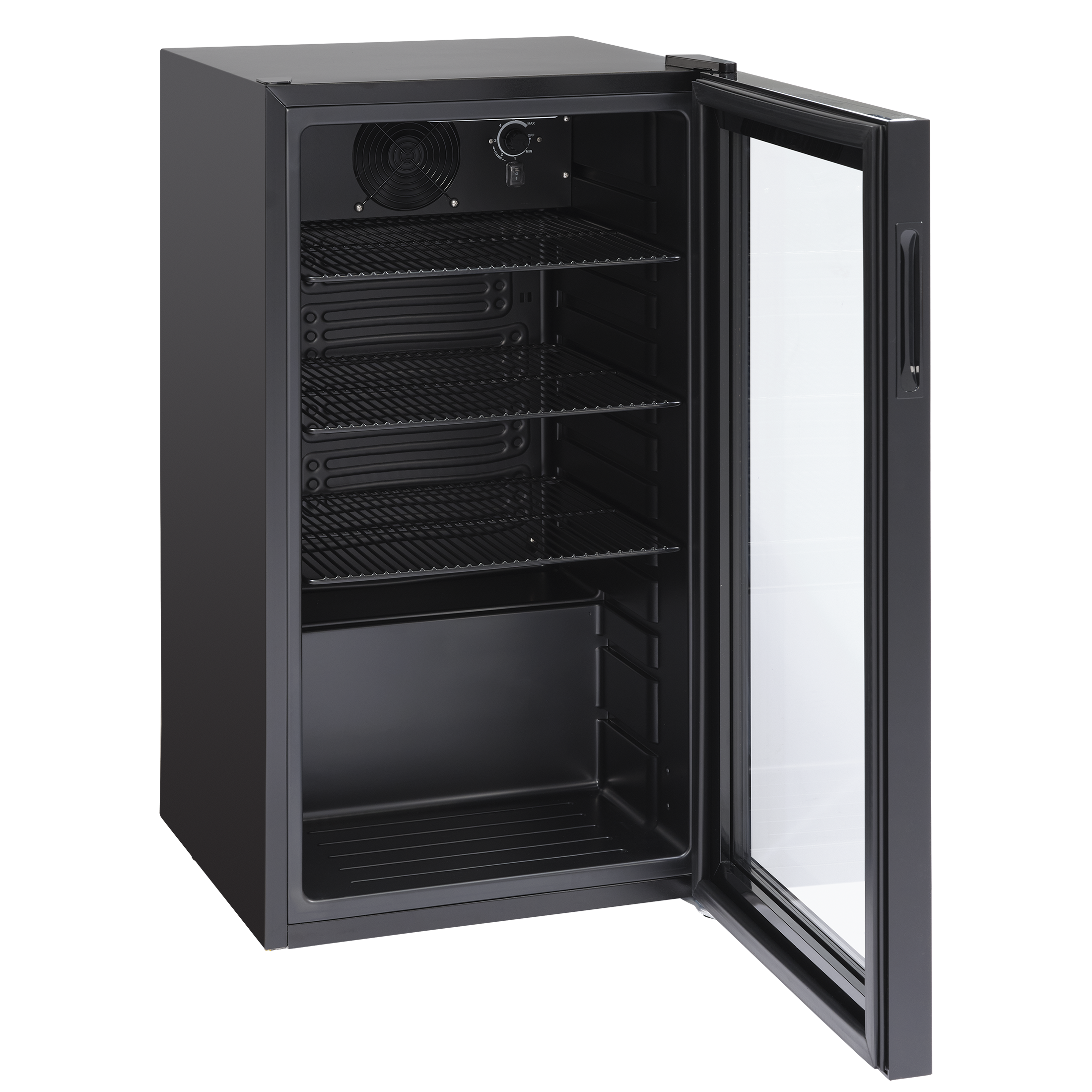 <p><strong>Black minibar Scandomestic with glass door!</strong></p><p>Mechanical controller to adjust the temperature in the cabinet.</p><p>Temperature range from 0 to 10 °C<br>Suitable for branding.<br>Fan assisted static cooling system.<br>LED interior light.</p><p><strong>Capacity of bottles and cans</strong>:</p><p>33 cl Bottle 230,0 x 63,0 mm: 55 pcs.<br>50 cl Bottle 260,0 x 66,7 mm: 49 pcs.<br>25 cl Can 134,0 x 53,3 mm: 149 pcs.<br>33 cl Can 115,2 x 66,3 mm: 110 pcs.<br>33 cl Slim Can 146,0 x 57,5 mm: 104 pcs.<br>50 cl Can 160,0 x 66,3 mm: 74 pcs.</p>