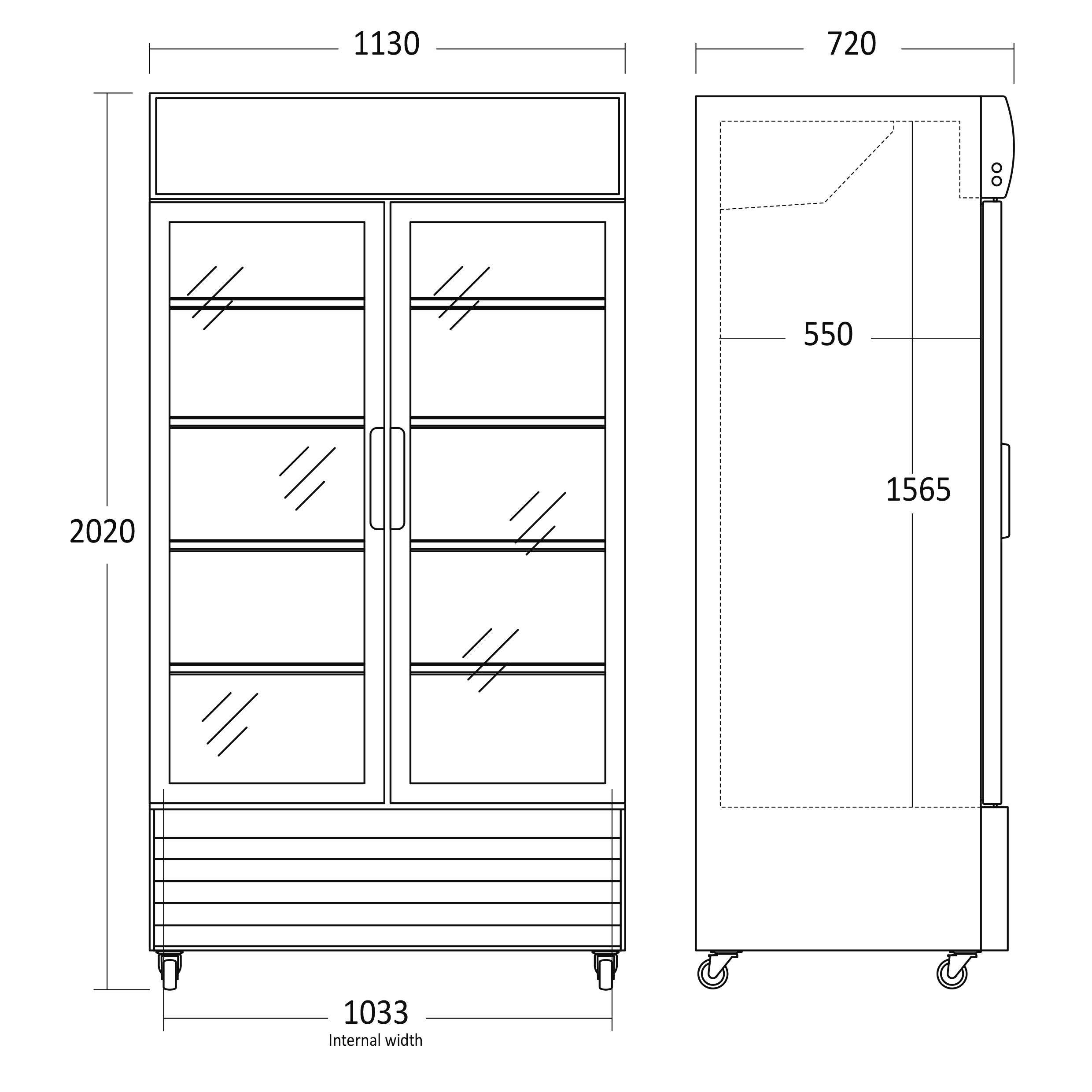 Kaapissa on kaksi täyskorkeaa saranoitua lasiovea, jotka sulkeutuvat itsestään ja ovat lukittavissa. LED-sisävalaistus kahdella pystysuuntaisella valolla korostaa tuotteita ja tekee esillepanosta houkuttelevan. Neljä tukevaa pyörää mahdollistavat kaapin siirtämisen ja helpottavat huoltoa.
