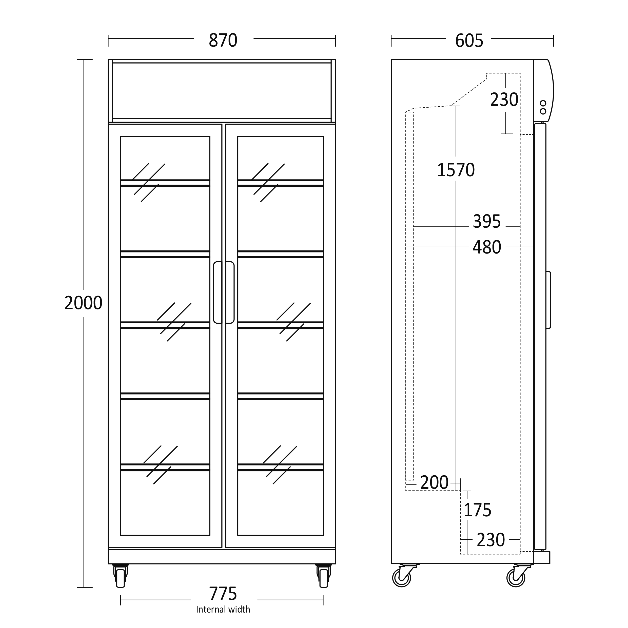 Kaapissa on kaksi täyskorkeaa, itsestään sulkeutuvaa lasiovea, jotka voi myös lukita. Ovet tarjoavat erinomaisen näkyvyyden sisällölle ja pitävät kylmän tehokkaasti sisällä. Sisätilassa oleva pystysuuntainen LED-valaistus tekee tuotteiden esillepanosta houkuttelevan ja selkeän. Neljä tukevaa pyörää mahdollistavat helpon siirtämisen ja puhdistamisen.