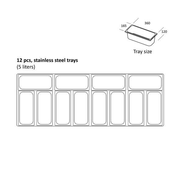 SIC12WB toimitetaan kahdellatoista 5 litran teräksisellä jäätelöastialla, jotka ovat kestäviä, hygieenisiä ja helppoja puhdistaa. Lisäksi laitteen takaosassa on säilytystila jopa kahdeksalle lisäastialle, mikä tekee mallista erittäin tehokkaan suurivolyymiseen jäätelömyyntiin. Sisätilan rakenne tukee sujuvaa annostelua ja nopeaa työskentelyä.
