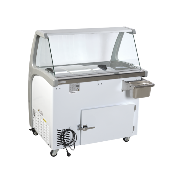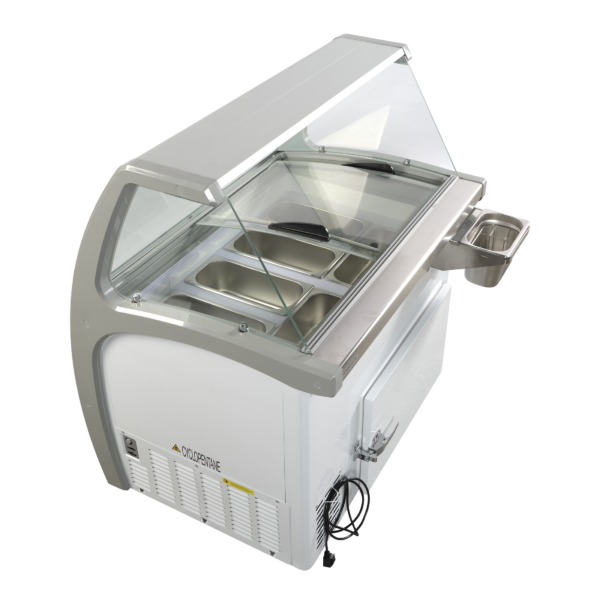Jäätelöpakastimen yläosassa sijaitsee kaareva hygieniasuoja (sneeze guard), joka parantaa tuotteiden näkyvyyttä ja suojaa niitä samalla hygieenisesti. Liukuvat lasikannet ovat lukittavat, mikä lisää turvallisuutta ja helpottaa käyttöä erityisesti sulkemisaikaan. LED-valaistus sekä etu- että sisäosassa korostaa tuotteita ja lisää myyvyyttä. Neljä tukevaa pyörää, joista kaksi jarrullisia, helpottavat laitteen siirtämistä ja puhdistusta.