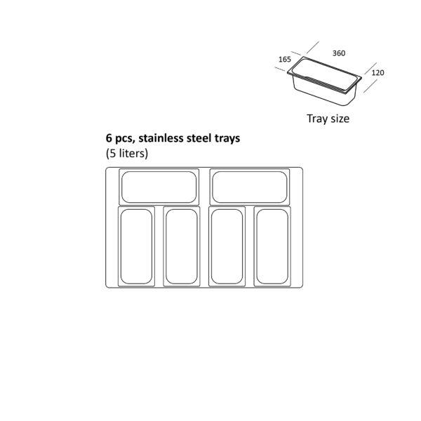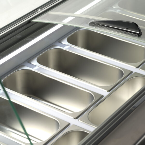 SIC6WB toimitetaan kuudella 5 litran teräksisellä jäätelöastialla, jotka ovat hygieenisiä, kestäviä ja helppoja puhdistaa. Lisäksi laitteen takaosassa on säilytystila jopa kahdeksalle lisäastialle, mikä tekee siitä erittäin toimivan ratkaisuun vilkkaaseen myyntiin ja nopeisiin täydennyksiin. Sisätila on muotoiltu tekeväksi annostelusta helppoa ja ergonomista.