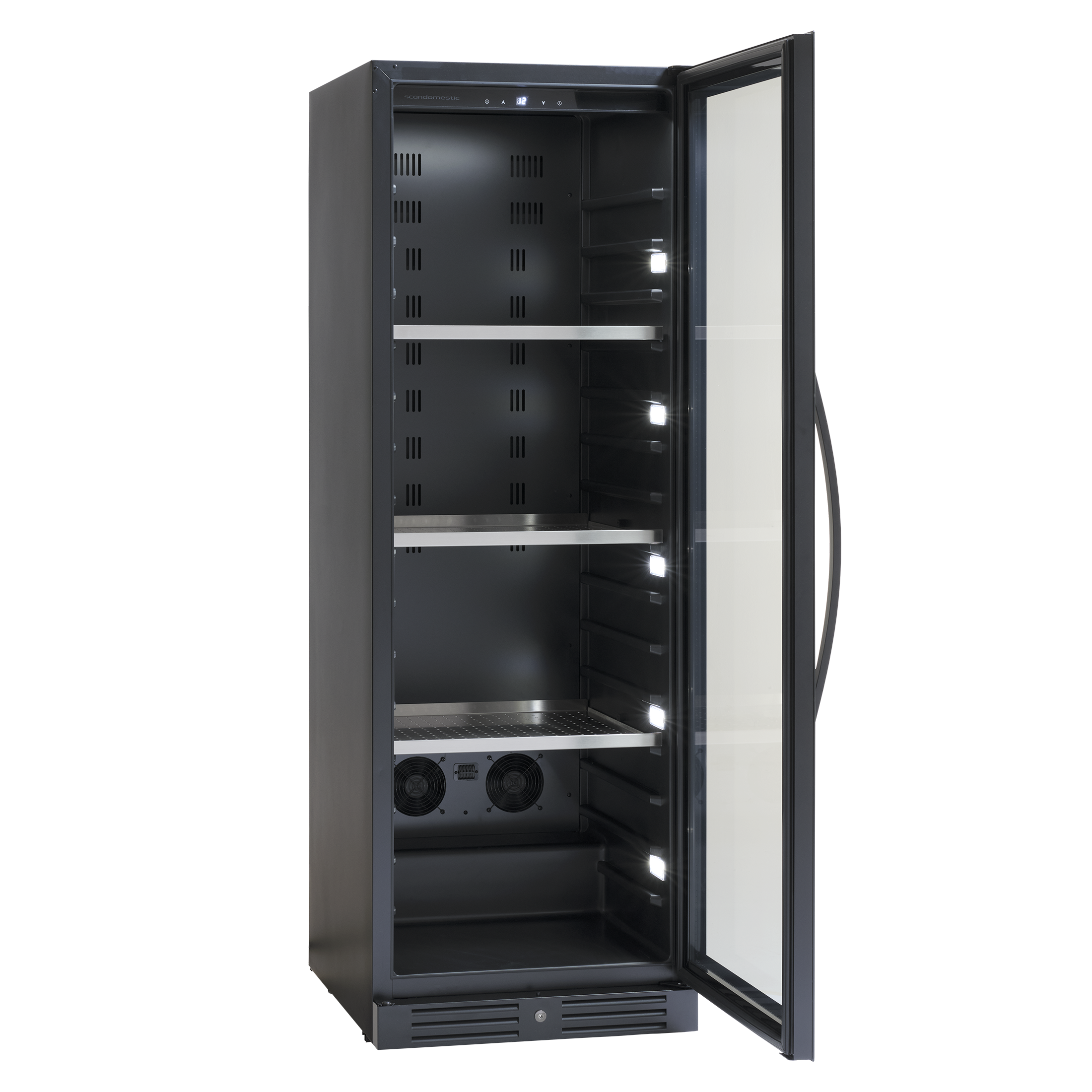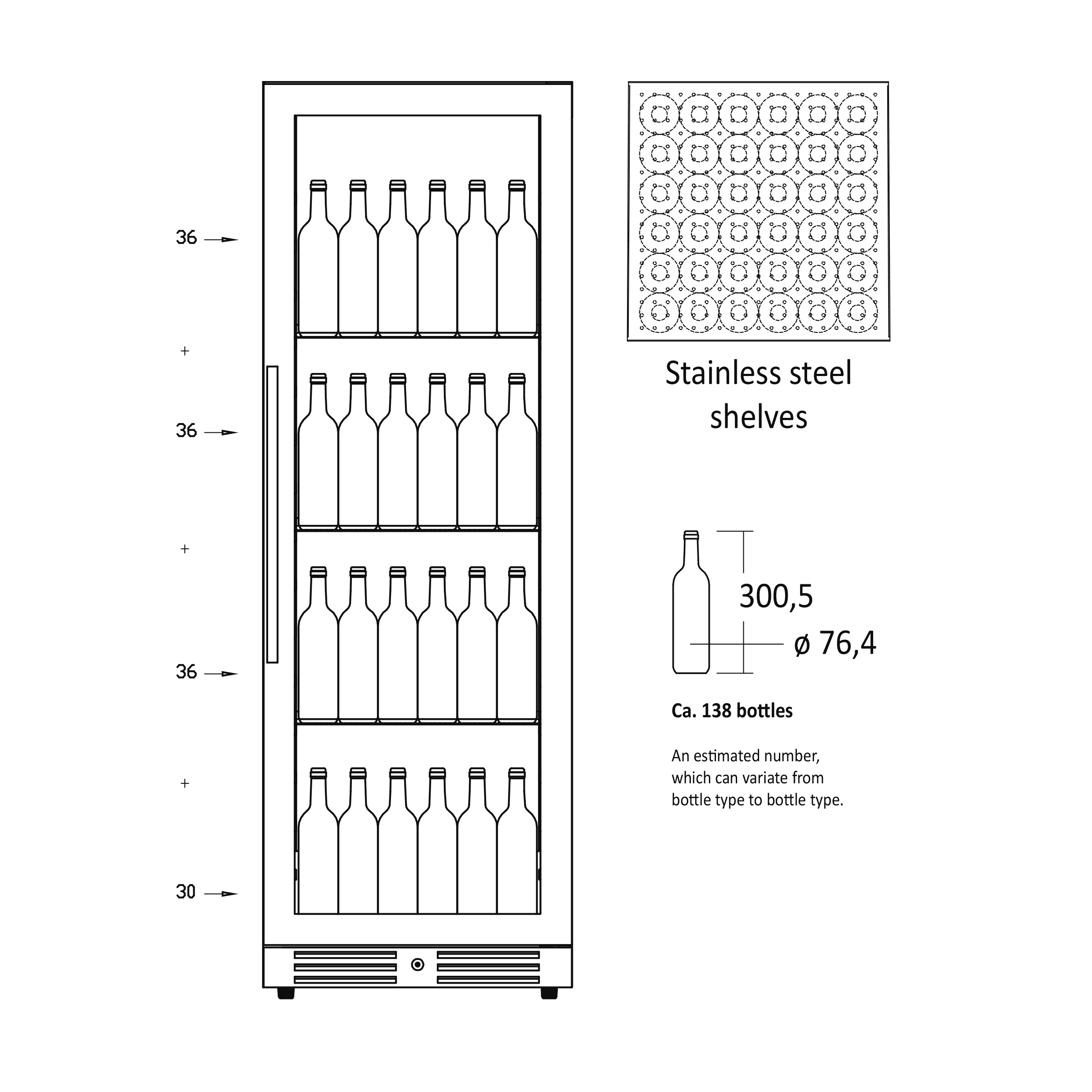 Musta runko ja kehyksetön lasiovi lukolla antavat kaapille modernin ja ammattimaisen ilmeen. Viinit säilytetään kolmella tukevalla teräshyllyllä pystyasennossa, mikä tekee etiketeistä helposti näkyviä ja nopeuttaa tarjoilua. Oikealle saranoitu ovi on käännettävissä, joten kaappi on helppo sovittaa eri tiloihin.