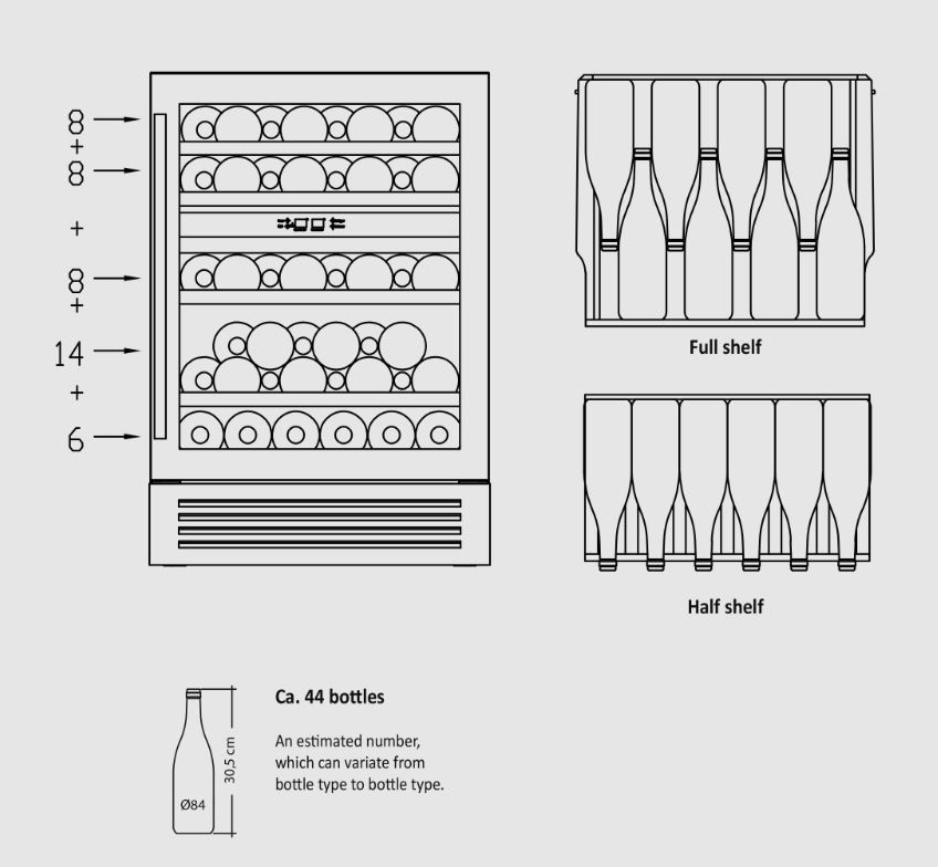 Kaappiin mahtuu 44 viinipulloa. Säilytys tapahtuu 4½ beechwood-puuhyllyllä, joista 4 on ulosvedettäviä ja ½ kiinteä. Ulosvedettävät hyllyt tekevät pulloihin tarttumisesta vaivatonta ja parantavat käyttömukavuutta arjessa.