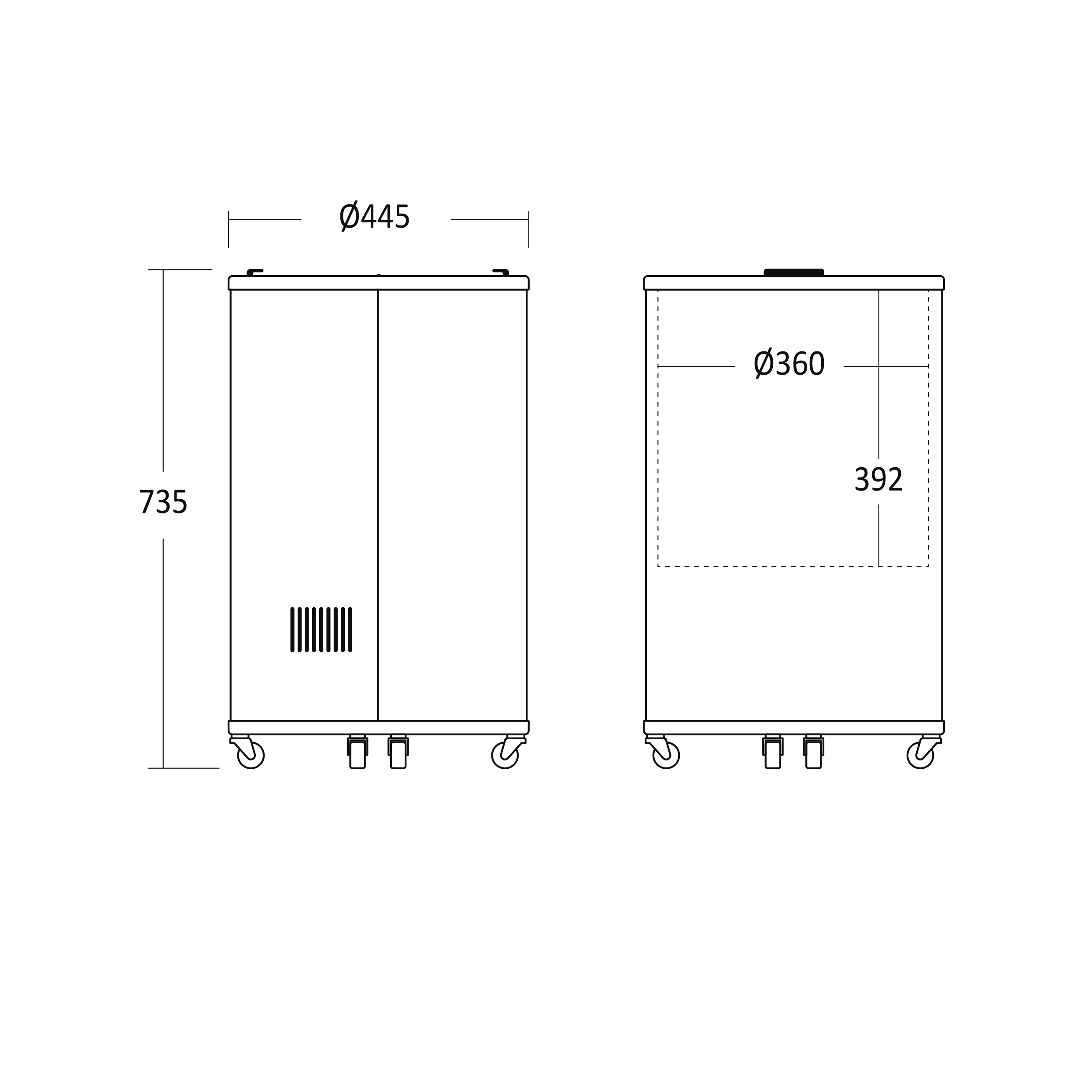 Korkeus 735 mm, leveys 445 mm, syvyys 445 mm.