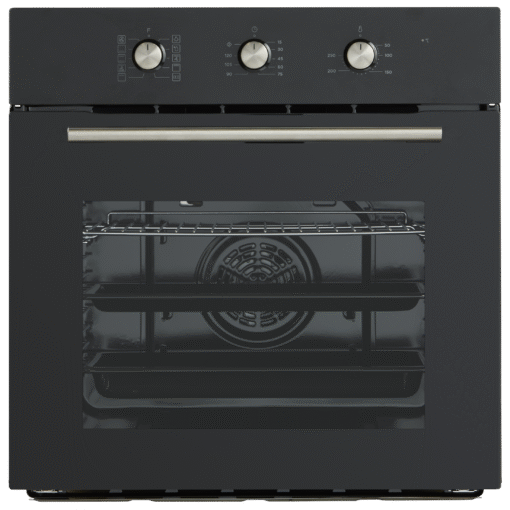 Uuni on suunniteltu sisäänrakennettavaksi ja sen muotoilu on tyylikäs — musta ulkoväri ja emaloitu sisätila luovat harmonisen kokonaisuuden keittiöön. Oven kahva on ruostumatonta terästä, mikä lisää käyttöikää ja ulkonäköä. Nupit ja ohjauspaneeli ovat selkeät ja kestävät, käyttö on vaivatonta arjessa.