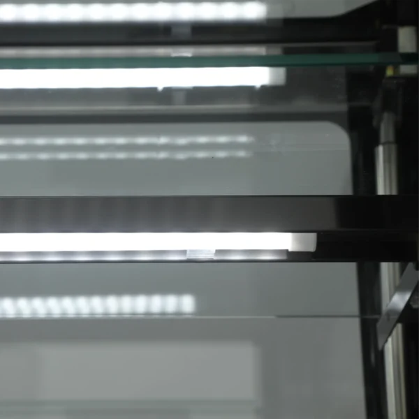 Vitriinissä on lasihyllyt sekä tasainen lasinen yläosa, jotka korostavat tuotteiden näkyvyyttä. LED-valaistus sijaitsee sekä vitriinin yläosassa että jokaisen hyllyn alla, mikä tekee tuotteista näyttäviä ja helposti nähtäviä asiakkaille. Huurtumista estävä etulasi parantaa näkyvyyttä myös vilkkaassa käytössä.