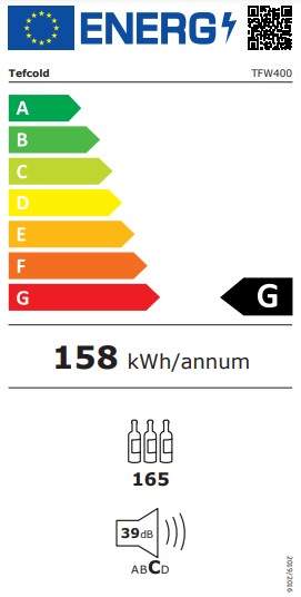 Tefcold TFW400-S kuuluu energialuokkaan G, mikä on yleistä tämän kokoluokan kompressoriviinikaapeissa.