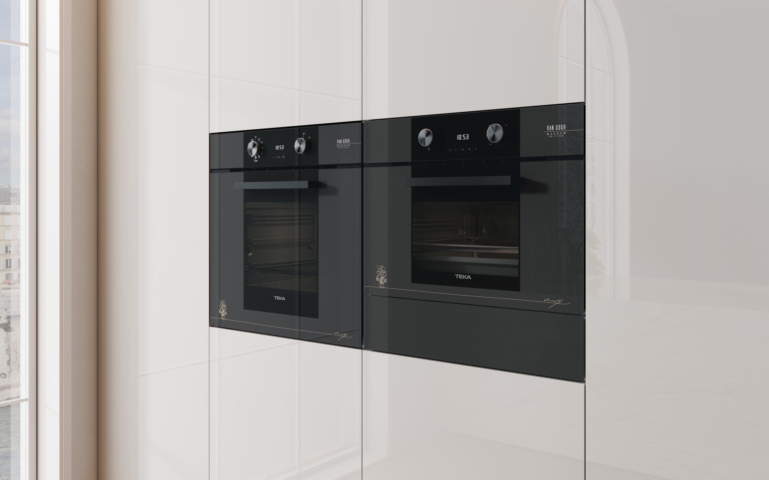 Teka HLB84VGOGH kuuluu Teka Van Gogh -mallistoon, joka on saanut inspiraationsa Vincent van Goghin Auringonkukat-teoksesta. Samppanjanväriset yksityiskohdat yhdistettynä tummanharmaaseen ja mustaan lasipintaan luovat ylellisen ja taiteellisen ilmeen moderniin keittiöön. Uuni yhdistää näyttävän muotoilun ja käytännölliset ruoanlaitto-ominaisuudet.