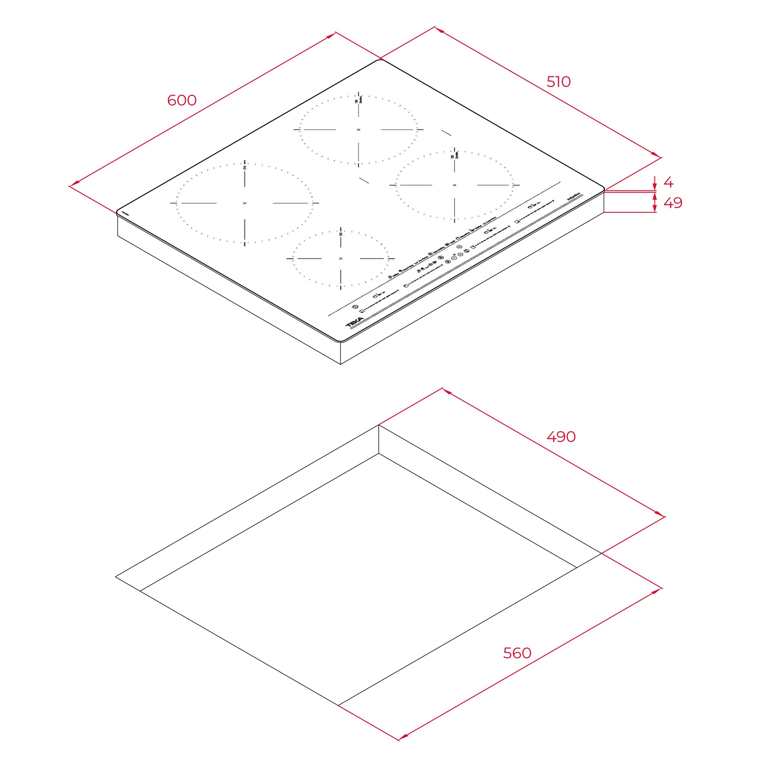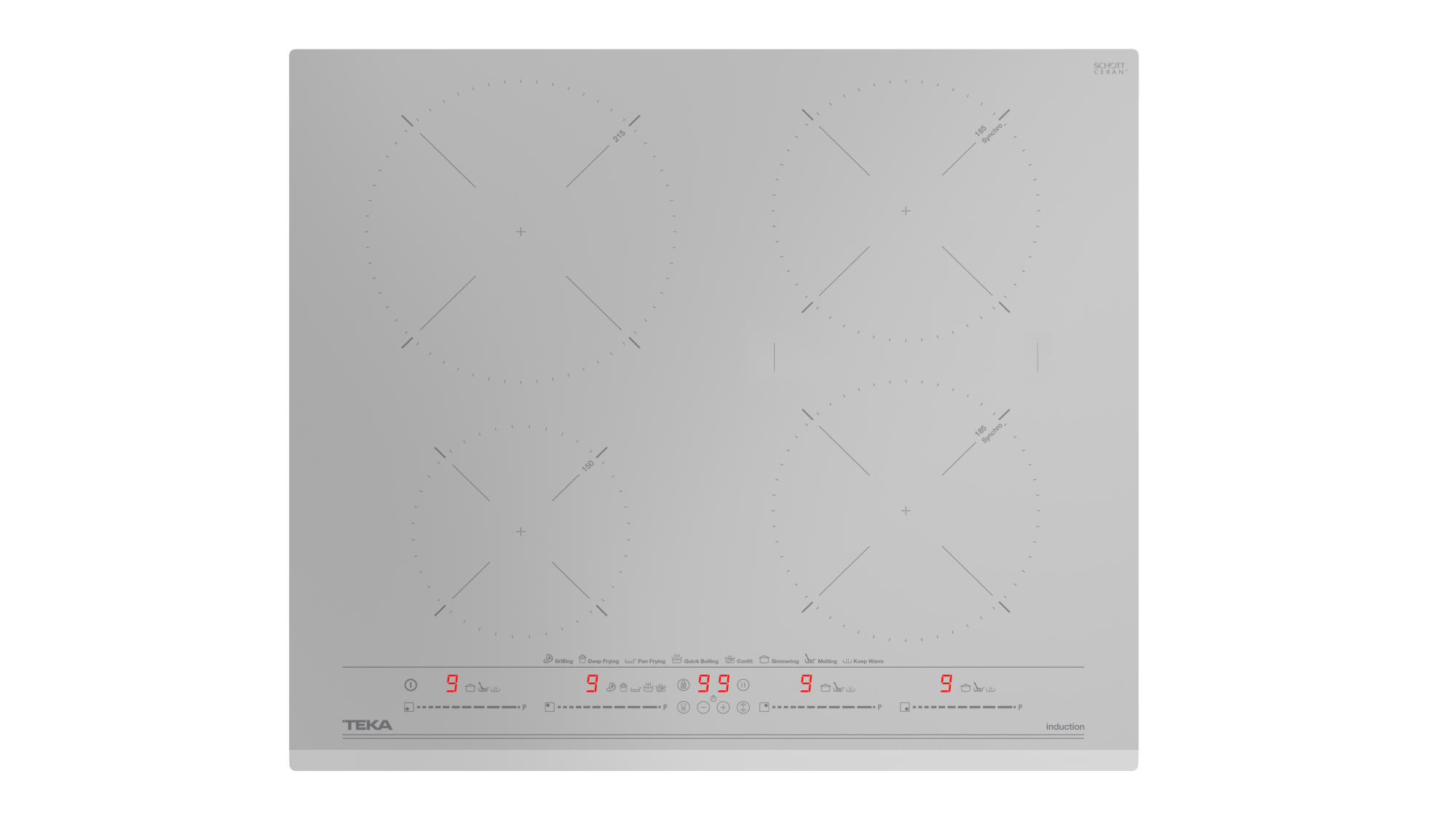 Neljä keittoaluetta: 1 × Ø215 mm, 2 × Ø185 mm ja 1 × Ø150 mm, jotka soveltuvat monipuolisesti eri kokoisille astioille.