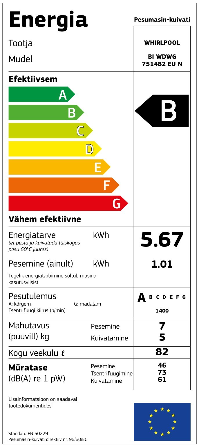 Whirlpool BIWDWG751482EUN – integroitava kuivaava pyykinpesukone