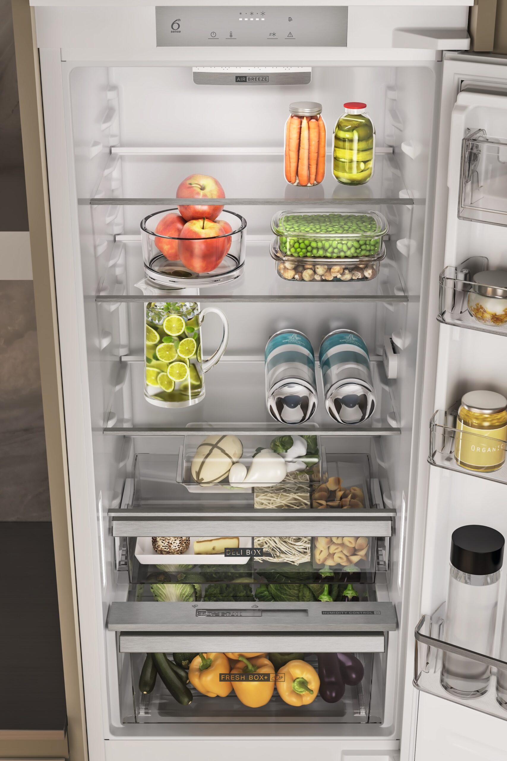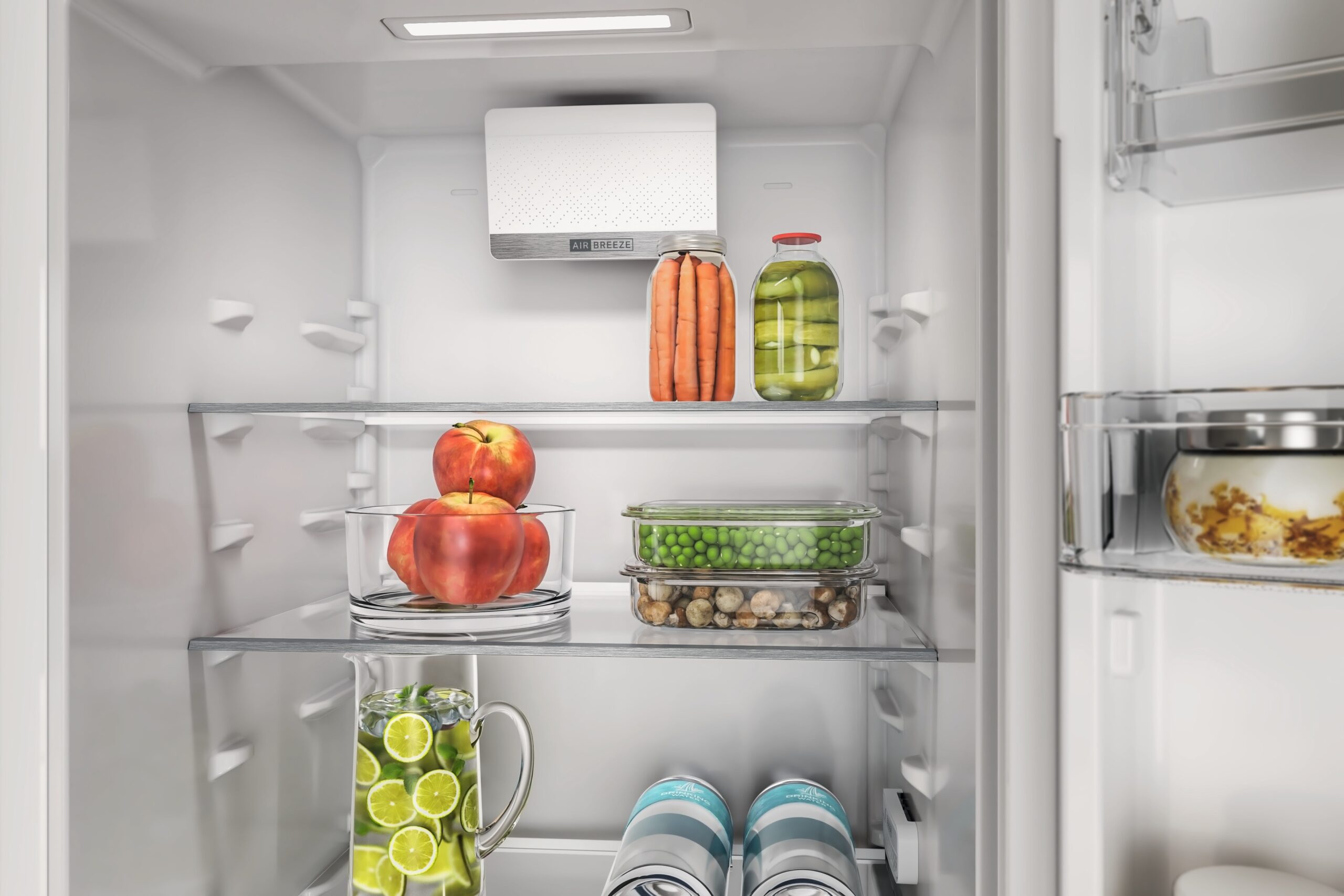 Avoimen oven hälytys ilmoittaa, jos ovi jää sulkematta, ja auttaa ehkäisemään lämpötilan nousua ja ruokahävikkiä. Hyllyt, pulloteline ja easy access -tarjotin tekevät elintarvikkeiden säilyttämisestä ja käyttämisestä sujuvaa.