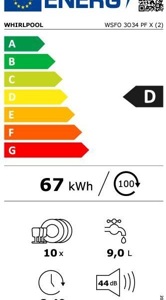 Whirlpool WSFO3O34PFX kuuluu energialuokkaan D, mikä on hyvä taso kapealle 45 cm leveälle astianpesukoneelle.